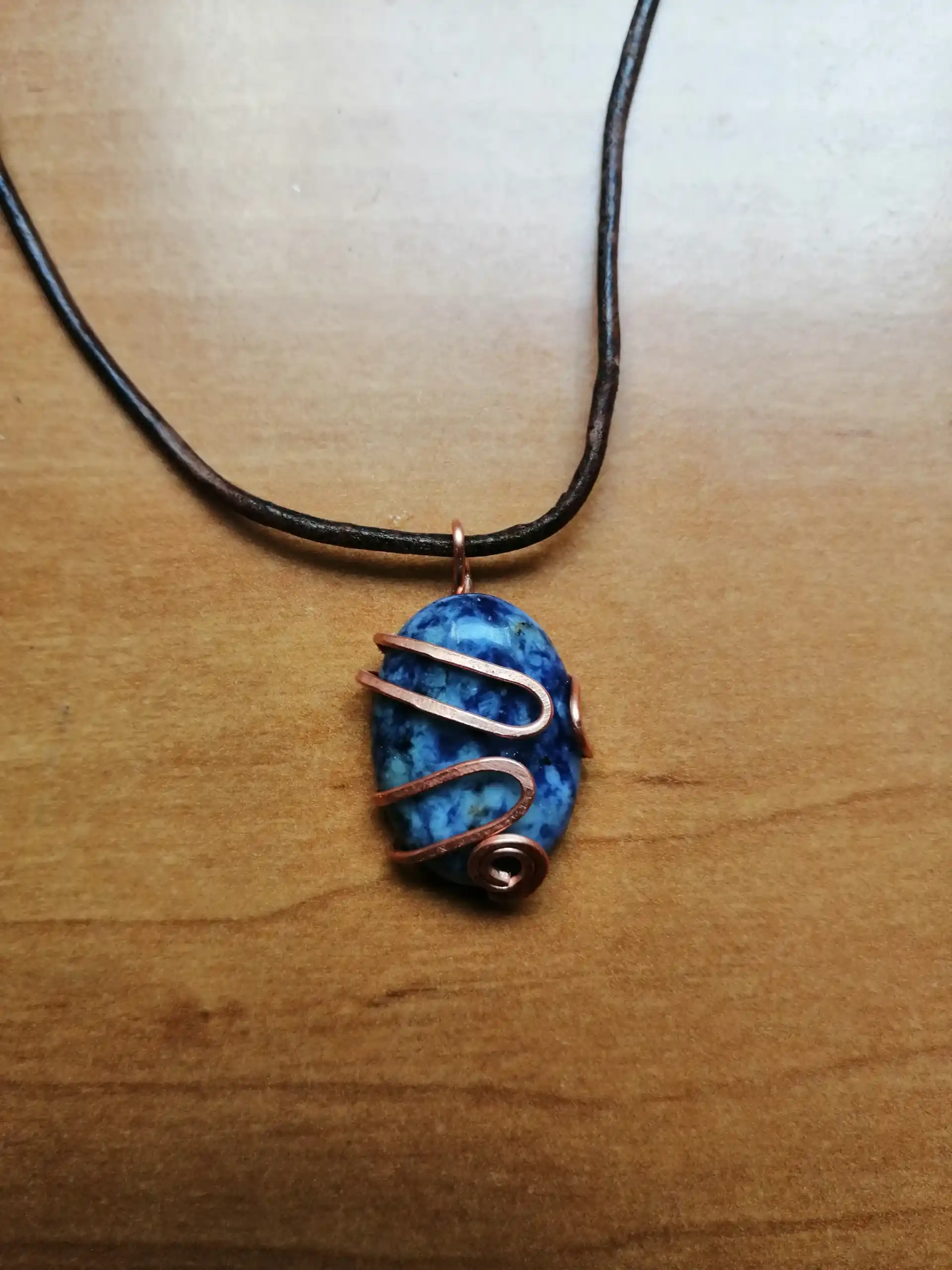 Naszyjnik Jaspis w miedzi. Piękny naszyjnik w kolorze niebieskim, wykonany z jaspisu i miedzi. Doskonały dodatek do każdej stylizacji. Rozmiar kamienia 2×2,3cm. Zawieszony na rzemieniu ze skóry naturalnej w kolorze ciemnego brązu, woskowanej. Jeżeli wolisz skórę ekologiczną, nie ma problemu. Napisz do mnie a specjalnie dla Ciebie zrobię zawieszkę ze skóry ekologicznej. Zapięcie jest tak zrobione, że każdy bez problemu przełoży naszyjnik przez głowę. Następnie można w łatwy sposób wyregulować wysokość na jakiej ma być zawieszony naszyjnik.